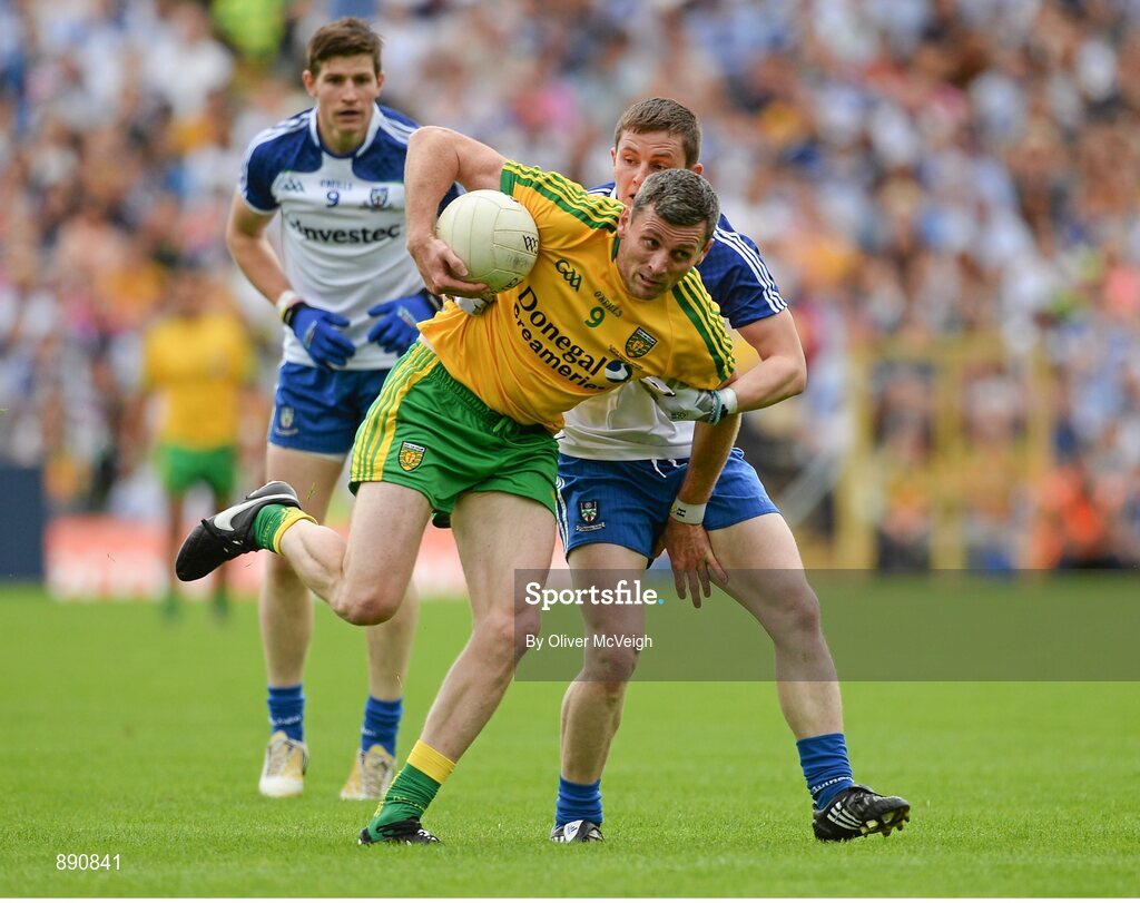 20 July 2014; Christy Toye, Donegal, in action against Dermot Malone, Monaghan. Ulster GAA Football Senior Championship Final, Donegal v Monaghan, St Tiernach's Park, Clones, Co. Monaghan. Picture credit: Oliver McVeigh / SPORTSFILE