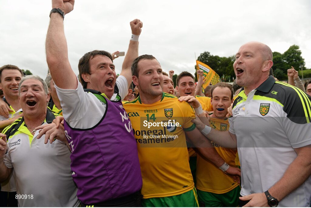 20 July 2014; Donegal's Michael Murphy, right, celebrates with John Duffy, selector, after the final whistle. Ulster GAA Football Senior Championship Final, Donegal v Monaghan, St Tiernach's Park, Clones, Co. Monaghan. Picture credit: Oliver McVeigh / SPORTSFILE