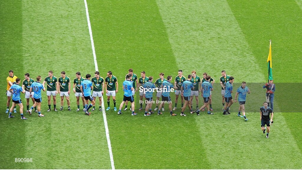 20 July 2014; The Dublin and Meath players shake hands before the game. Leinster GAA Football Senior Championship Final, Dublin v Meath, Croke Park, Dublin. Picture credit: Dáire Brennan / SPORTSFILE