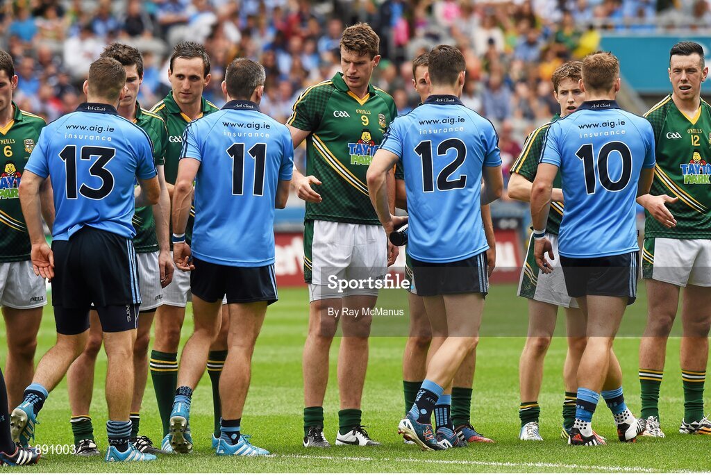 20 July 2014; Dublin players, from right to left, Paul Flynn, Diarmuid Connolly, Alan Brogan, and Kevin McManamon shake hands with Meath players before the game. Leinster GAA Football Senior Championship Final, Dublin v Meath, Croke Park, Dublin. Picture credit: Ray McManus / SPORTSFILE