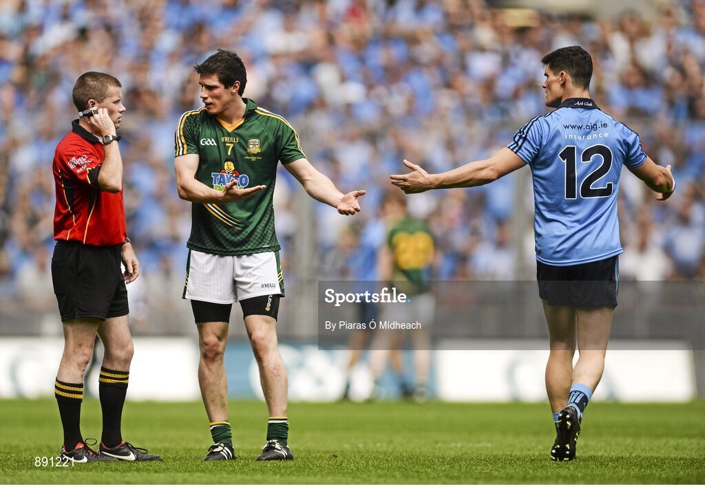 20 July 2014; Donncha Tobin, Meath, and Diarmuid Connolly, Dublin, in conversation with referee Padraig Hughes before both players were shown the yellow card. Leinster GAA Football Senior Championship Final, Dublin v Meath, Croke Park, Dublin. Picture credit: Piaras Ó Mídheach / SPORTSFILE