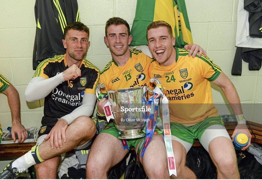 20 July 2014; Michael Boyle, Patrick McBrearty and Luke Kearney, Donegal celebrate with the Anglo Celt cup after the game. Ulster GAA Football Senior Championship Final, Donegal v Monaghan, St Tiernach's Park, Clones, Co. Monaghan. Picture credit: Oliver McVeigh / SPORTSFILE