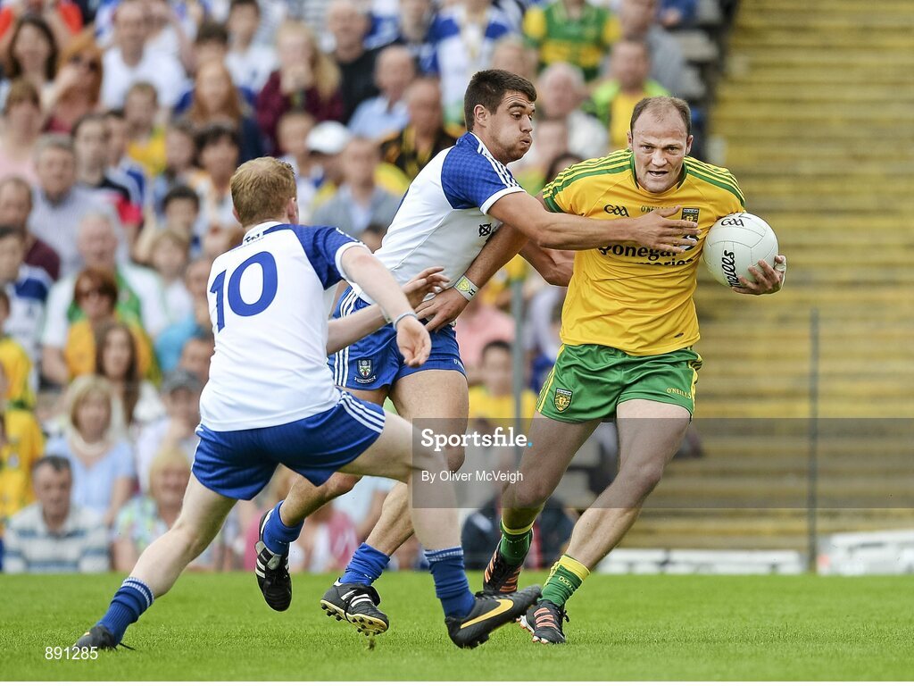 20 July 2014; Colm McFadden, Donegal, in action against Paudie McKenna and Drew Wylie, Monaghan. Ulster GAA Football Senior Championship Final, Donegal v Monaghan, St Tiernach's Park, Clones, Co. Monaghan. Picture credit: Oliver McVeigh / SPORTSFILE