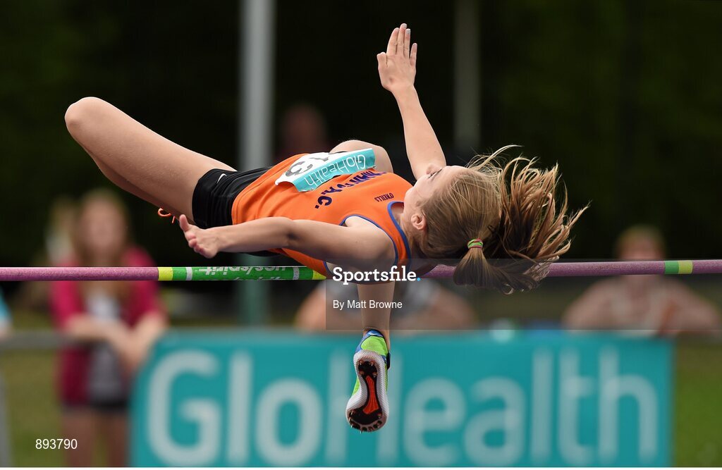 26 July 2014; Holly Meredith, from St. Marys AC, Co. Limerick, on her way to winning the girls under-13 high jump. GloHealth Juvenile Track and Field Championships, Tullamore Harriers AC, Tullamore, Co. Offaly. Picture credit: Matt Browne / SPORTSFILE