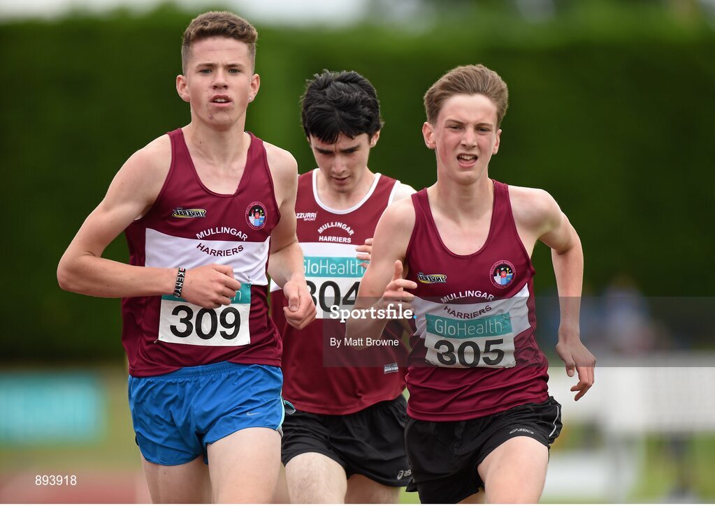 26 July 2014; Shane Hughes, 309, from Mullingar Harriers AC, Co. Westmeath, on his way to winning U17 3000m ahead of his team-mates Patrick Shaw, 304, who finished second, and Cormac Dalton, right, who finished in third place. GloHealth Juvenile Track and Field Championships, Tullamore Harriers AC, Tullamore, Co. Offaly. Picture credit: Matt Browne / SPORTSFILE
