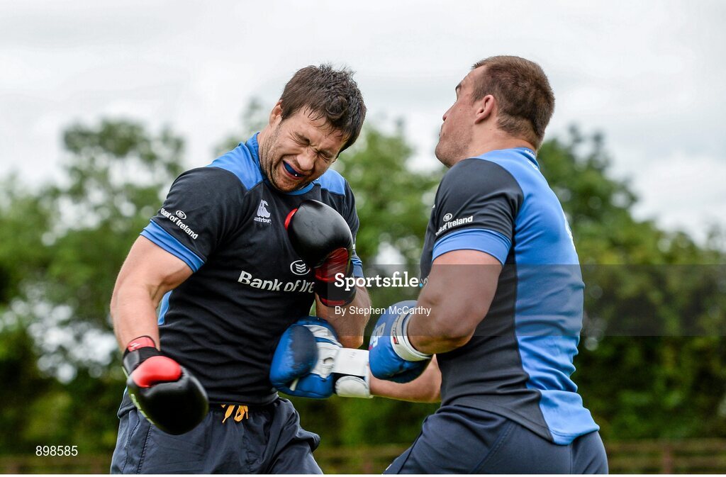 8 August 2014; Leinster's Kevin McLaughlin, left, and Rhys Ruddock take part in some boxing during squad training at a Leinster Rugby Training Open Day held in Ashbourne RFC, Ashbourne, Co. Meath. Picture credit: Stephen McCarthy / SPORTSFILE