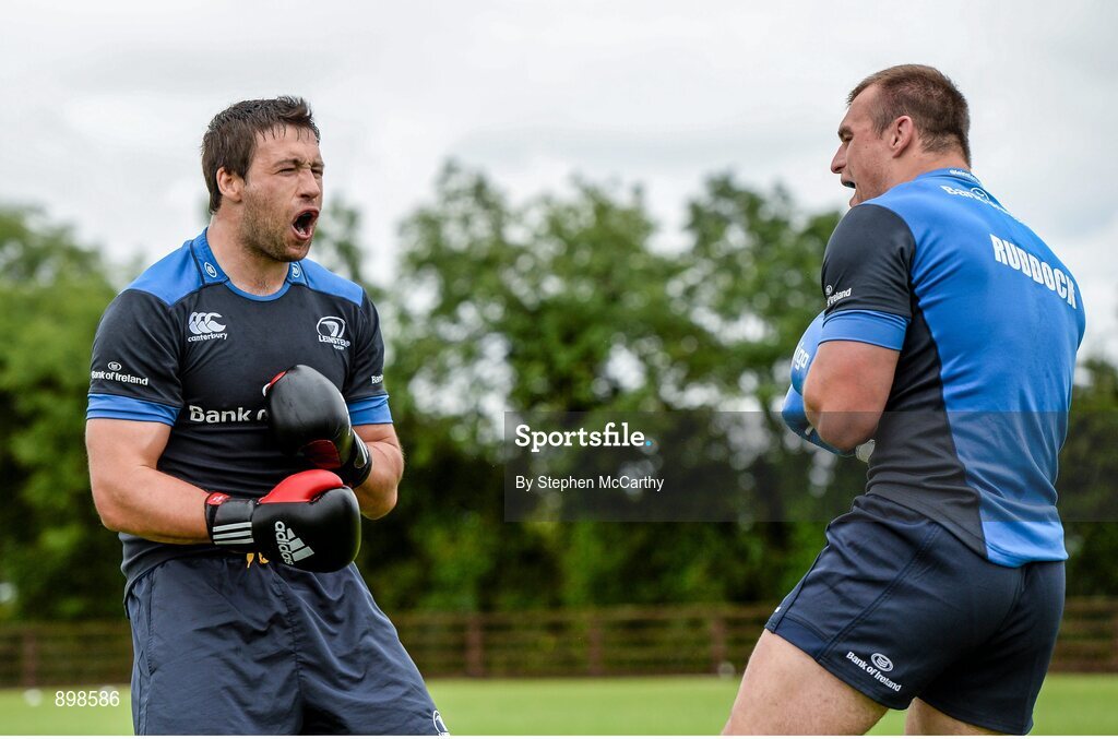 8 August 2014; Leinster's Kevin McLaughlin reacts after Rhys Ruddock landed a punch as the players took part in some boxing during squad training at a Leinster Rugby Training Open Day held in Ashbourne RFC, Ashbourne, Co. Meath. Picture credit: Stephen McCarthy / SPORTSFILE