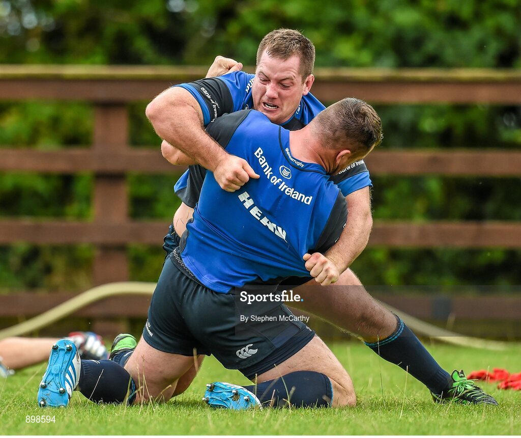 8 August 2014; Leinster's Michael Bent, left, and Cian Healy take part in some grappling during squad training at a Leinster Rugby Training Open Day held in Ashbourne RFC, Ashbourne, Co. Meath. Picture credit: Stephen McCarthy / SPORTSFILE