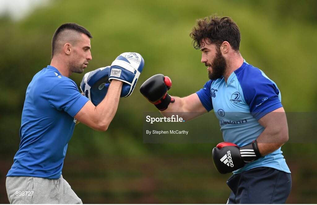 8 August 2014; Leinster's Mick McGrath with Cillian Reardon, strength & conditioning coach, during squad training at a Leinster Rugby Training Open Day held in Ashbourne RFC, Ashbourne, Co. Meath. Picture credit: Stephen McCarthy / SPORTSFILE