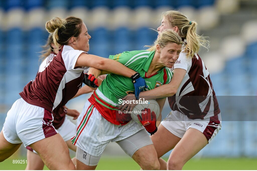 9 August 2014; Cora Staunton, Mayo, in action against Rebecca Dunne and Lorraine Duncan, Westmeath. TG4 All-Ireland Ladies Football Senior Championship, Round 2 Qualifier, Mayo v Westmeath, Pearse Park, Longford. Picture credit: Oliver McVeigh / SPORTSFILE