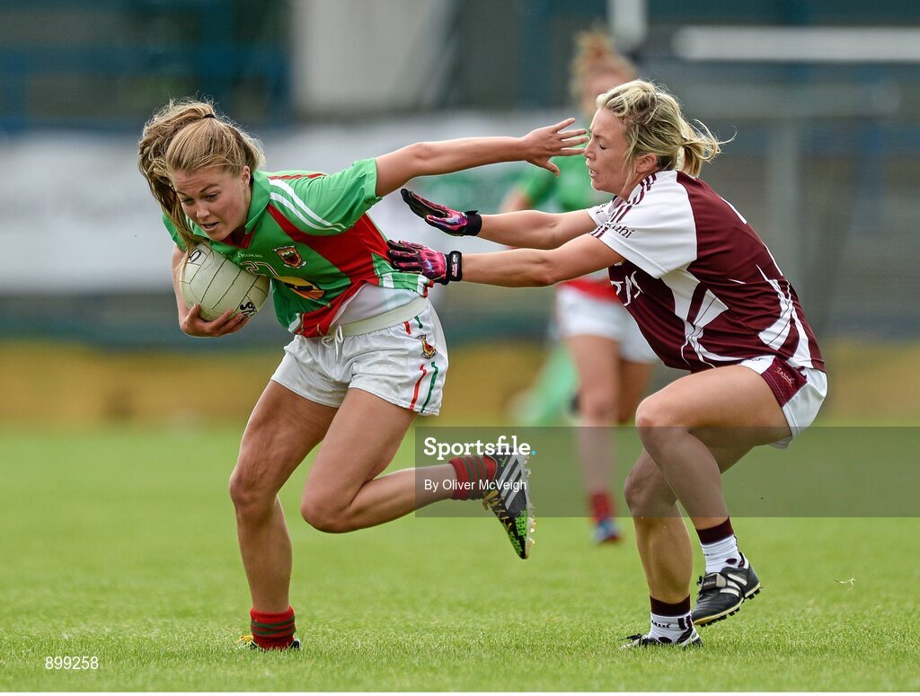 9 August 2014; Sarah Rowe, Mayo, in action against Aileen Martin, Westmeath. TG4 All-Ireland Ladies Football Senior Championship, Round 2 Qualifier, Mayo v Westmeath, Pearse Park, Longford. Picture credit: Oliver McVeigh / SPORTSFILE