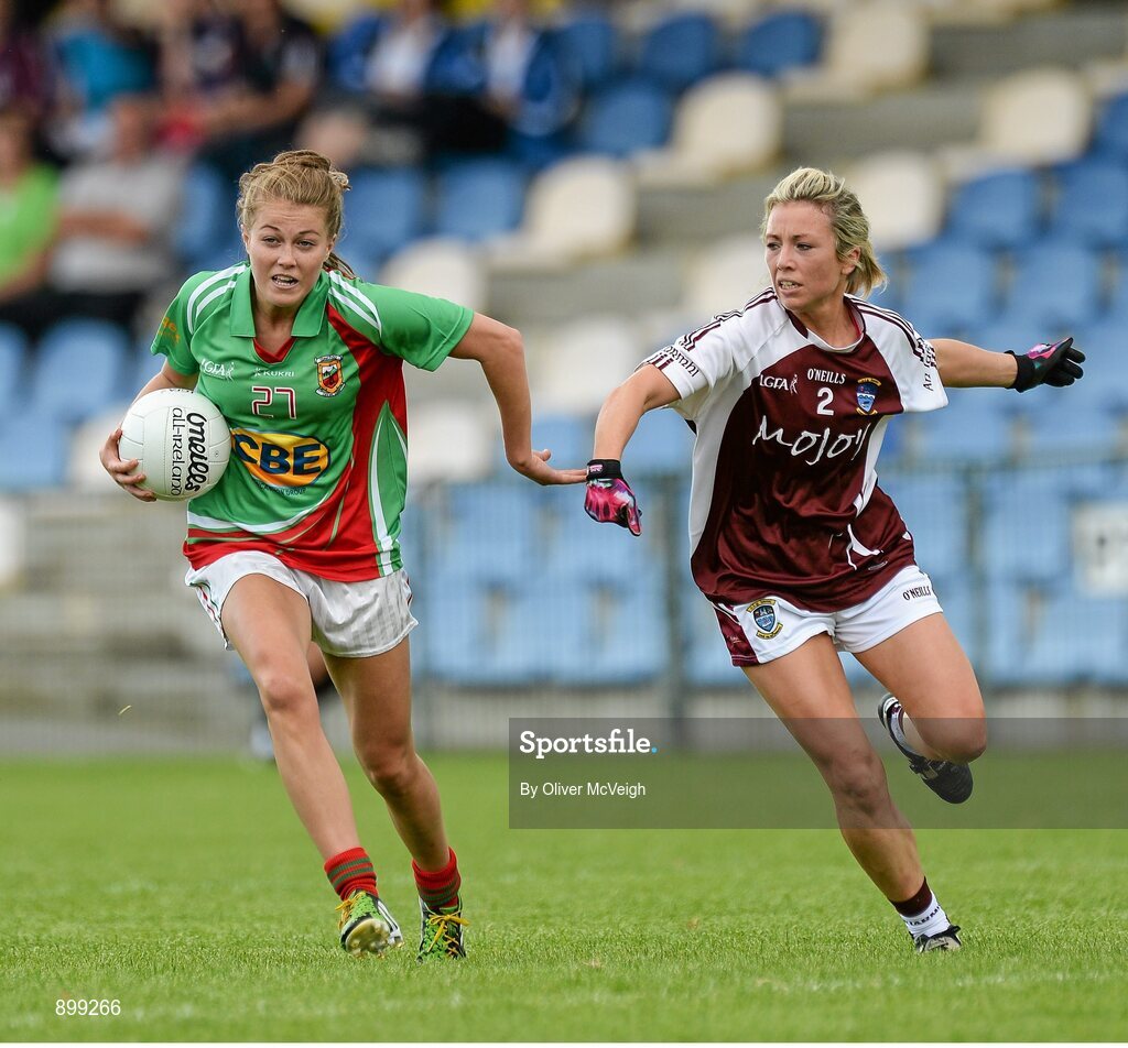9 August 2014; Sarah Rowe, Mayo, in action against Aileen Martin, Westmeath. TG4 All-Ireland Ladies Football Senior Championship, Round 2 Qualifier, Mayo v Westmeath, Pearse Park, Longford. Picture credit: Oliver McVeigh / SPORTSFILE