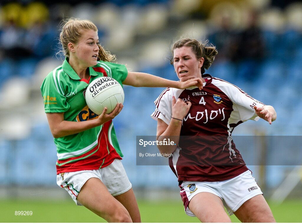 9 August 2014; Sarah Rowe, Mayo, in action against Triona Durkan, Westmeath. TG4 All-Ireland Ladies Football Senior Championship, Round 2 Qualifier, Mayo v Westmeath, Pearse Park, Longford. Picture credit: Oliver McVeigh / SPORTSFILE
