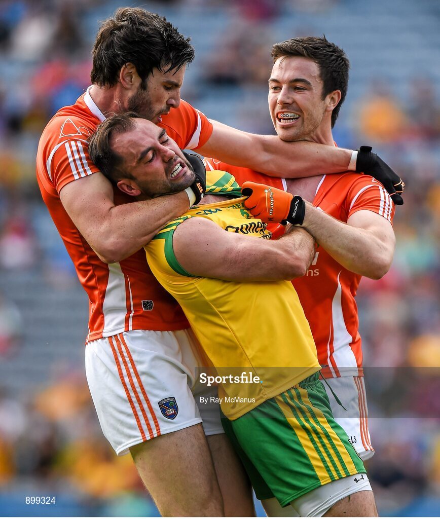 9 August 2014; Armagh's Aaron Findon, left, gets involved, and was later given a yellow card, in the altercation between Karl Lacey, Donegal, and Aidan Forker, Armagh. GAA Football All-Ireland Senior Championship, Quarter-Final, Donegal v Armagh, Croke Park, Dublin. Picture credit: Ray McManus / SPORTSFILE