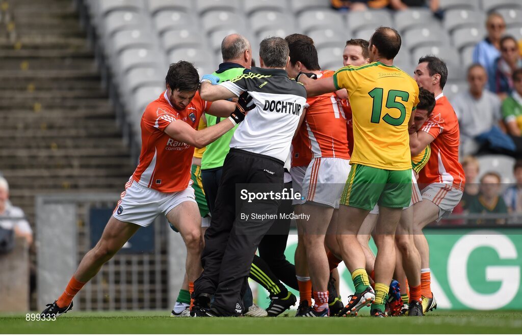 9 August 2014; Aaron Findon, Armagh, pushes Donegal team doctor Kevin Moran during an altercation in the first half. GAA Football All-Ireland Senior Championship, Quarter-Final, Donegal v Armagh, Croke Park, Dublin. Picture credit: Stephen McCarthy / SPORTSFILE