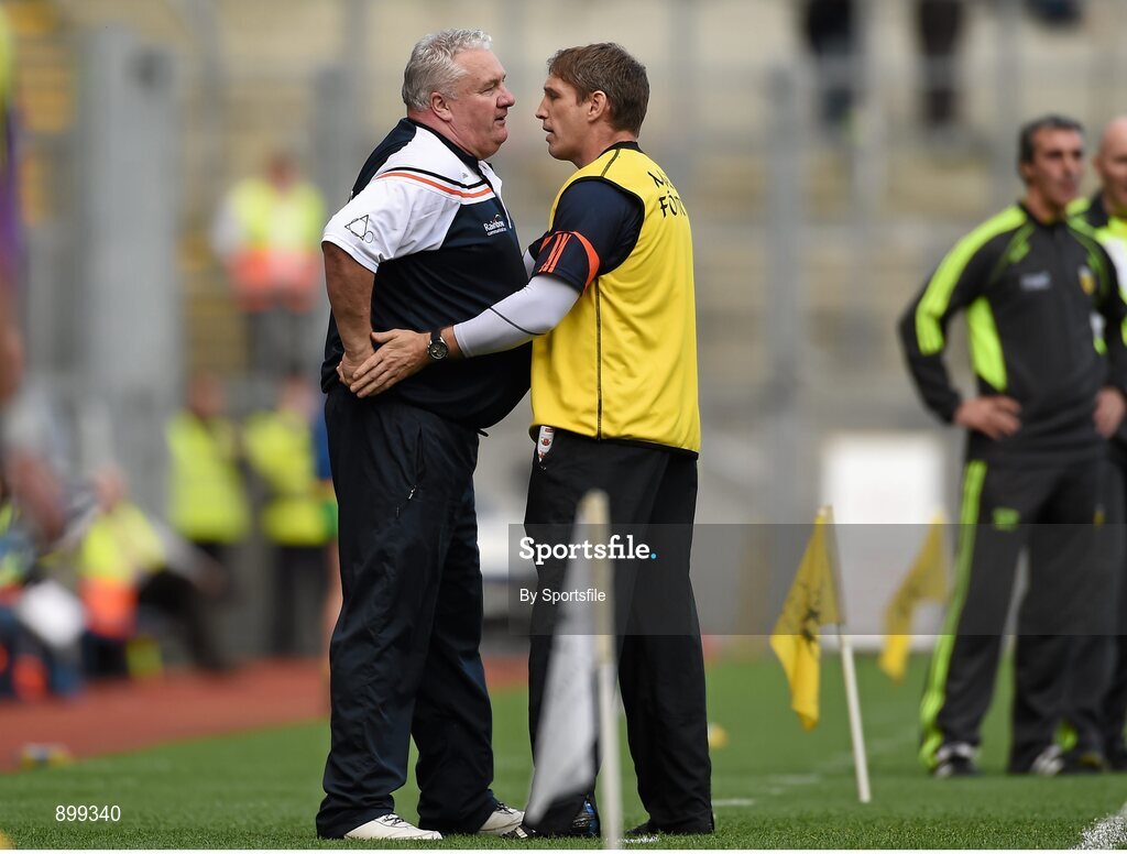 9 August 2014; Armagh manager Paul Grimley is restrained by Kieran McGeeney following an incident during the 1st half. GAA Football All-Ireland Senior Championship, Quarter-Final, Donegal v Armagh, Croke Park, Dublin. Photo by Sportsfile
