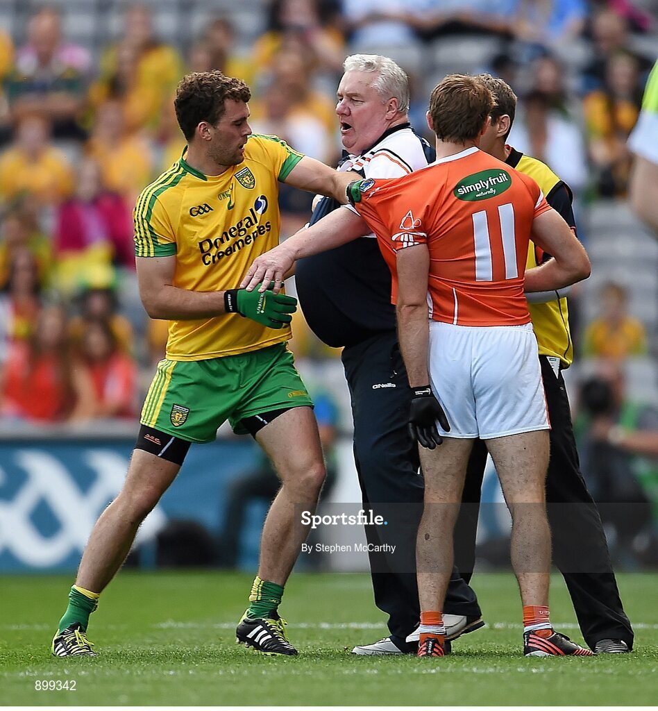 9 August 2014; Armagh manager Paul Grimley and assistant Kieran McGeeney with player Kevin Dyas exchange views with Eamonn McGee, Donegal. GAA Football All-Ireland Senior Championship, Quarter-Final, Donegal v Armagh, Croke Park, Dublin. Picture credit: Stephen McCarthy / SPORTSFILE