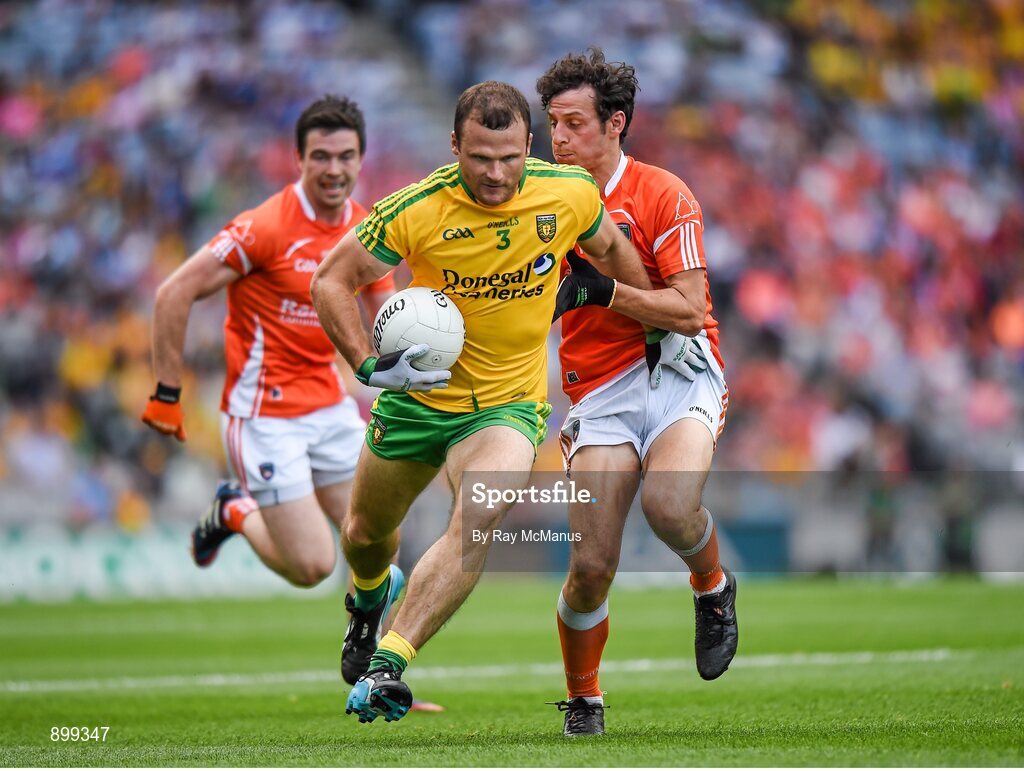 9 August 2014; Donegal full back Neil McGee races past Armagh's Jamie Clarke on his way to score a point in the 31st minute. GAA Football All-Ireland Senior Championship, Quarter-Final, Donegal v Armagh, Croke Park, Dublin. Picture credit: Ray McManus / SPORTSFILE