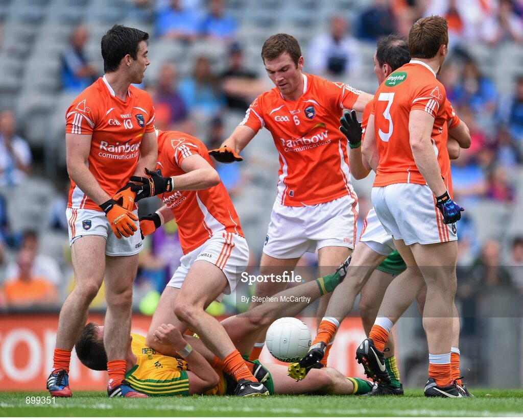 9 August 2014; Players from both sides including Leo McLoone, Donegal, and Aaron Findon, Armagh, during a first half altercation. GAA Football All-Ireland Senior Championship, Quarter-Final, Donegal v Armagh, Croke Park, Dublin. Picture credit: Stephen McCarthy / SPORTSFILE