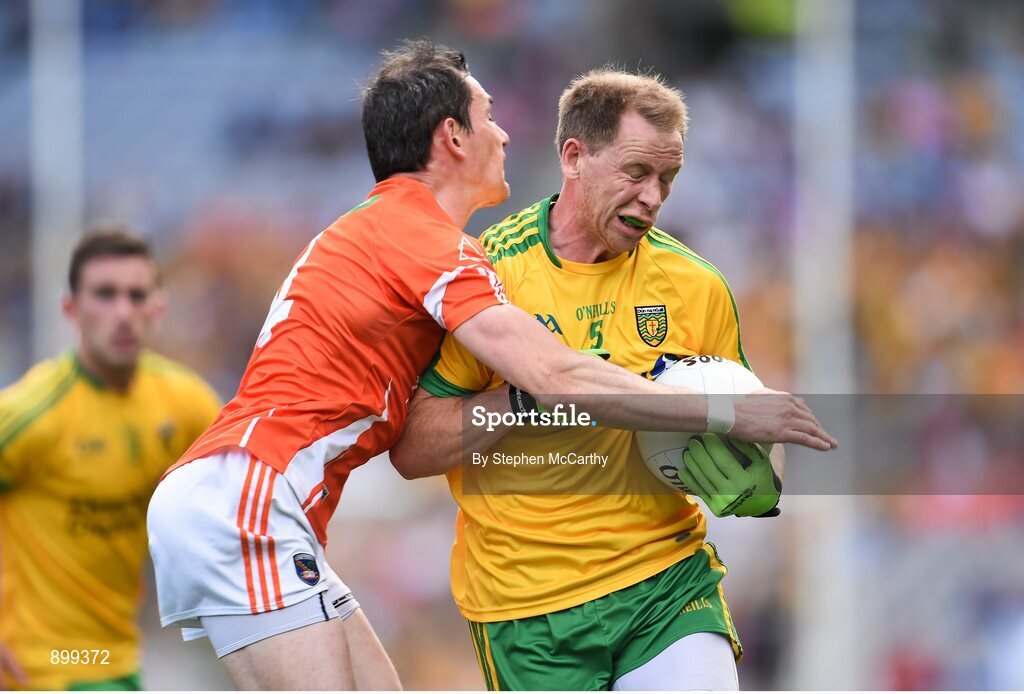9 August 2014; Anthony Thompson, Donegal, in action against Andy Mallon, Armagh. GAA Football All-Ireland Senior Championship, Quarter-Final, Donegal v Armagh, Croke Park, Dublin. Picture credit: Stephen McCarthy / SPORTSFILE