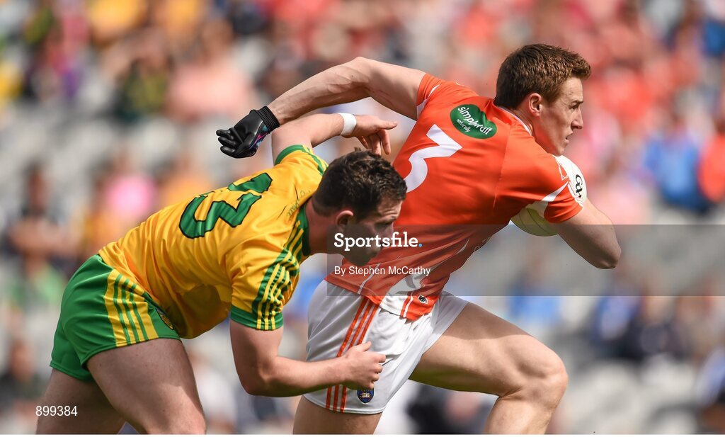 9 August 2014; Charlie Vernon, Armagh, in action against Patrick McBrearty, Donegal. GAA Football All-Ireland Senior Championship, Quarter-Final, Donegal v Armagh, Croke Park, Dublin. Picture credit: Stephen McCarthy / SPORTSFILE