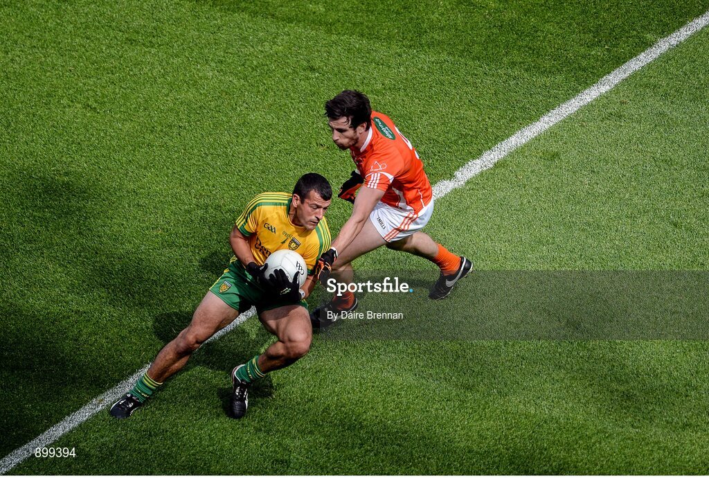 9 August 2014; Frank McGrath, Donegal, in action against Aaron Findon, Armagh. GAA Football All-Ireland Senior Championship, Quarter-Final, Donegal v Armagh, Croke Park, Dublin. Picture credit: Dáire Brennan / SPORTSFILE
