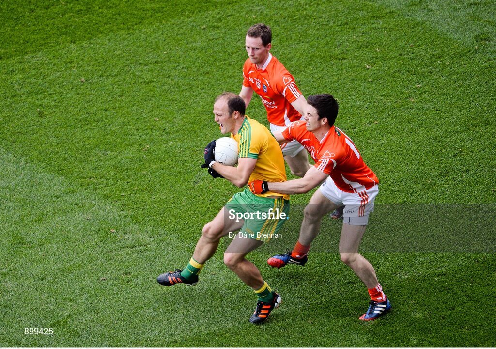 9 August 2014; Colm McFadden, Donegal, in action against Finnian Moriarty, left, and Aidan Forker, Armagh. GAA Football All-Ireland Senior Championship, Quarter-Final, Donegal v Armagh, Croke Park, Dublin. Picture credit: Dáire Brennan / SPORTSFILE