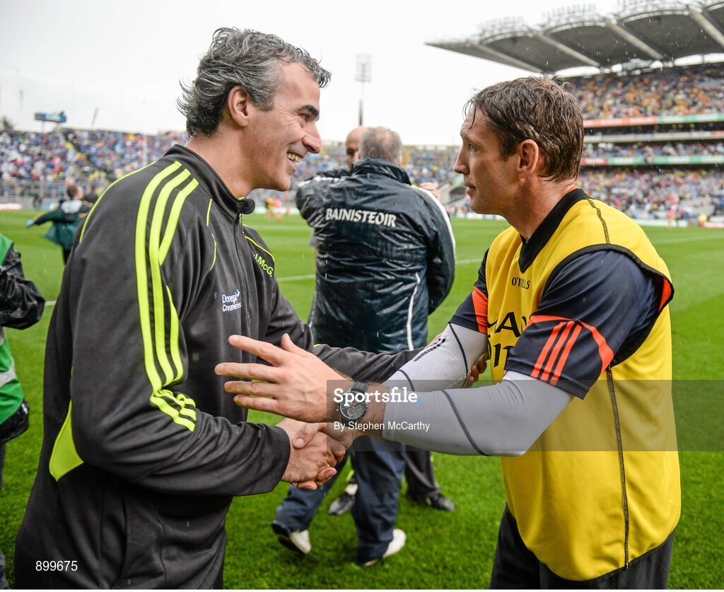 9 August 2014; Donegal manager Jim McGuinness with Armagh selector Kieran McGeeney after the game. GAA Football All-Ireland Senior Championship, Quarter-Final, Donegal v Armagh, Croke Park, Dublin. Picture credit: Stephen McCarthy / SPORTSFILE