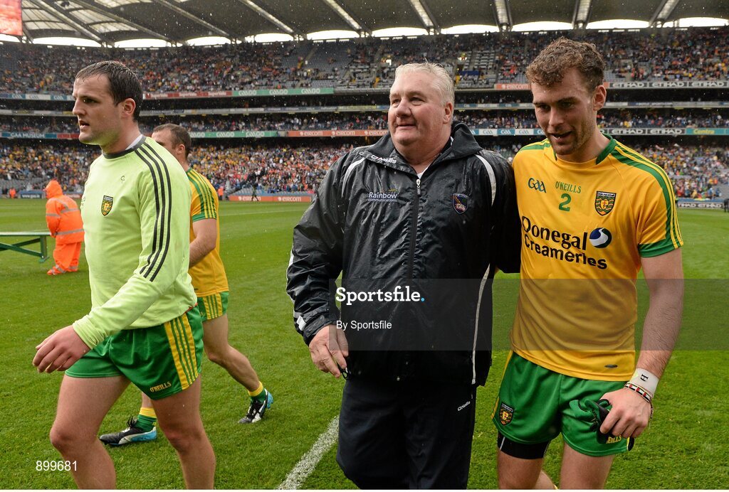 9 August 2014; Armagh manager Paul Grimley with Donegal's Eamonn McGee after the game. GAA Football All-Ireland Senior Championship, Quarter-Final, Donegal v Armagh, Croke Park, Dublin. Photo by Sportsfile