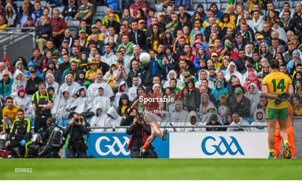 9 August 2014; Donegal captain Michael Murphy looks on as Armagh's Tony Kernan takes the last kick of the game - a free to Armagh who lost by a point. GAA Football All-Ireland Senior Championship, Quarter-Final, Donegal v Armagh, Croke Park, Dublin. Picture credit: Ray McManus / SPORTSFILE