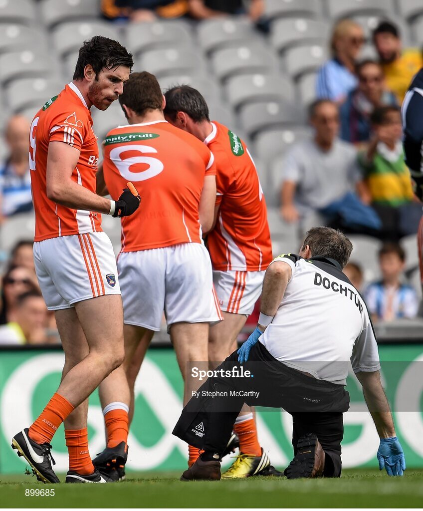 9 August 2014; Aaron Findon, Armagh, and Donegal team doctor Kevin Moran during an altercation in the first half. GAA Football All-Ireland Senior Championship, Quarter-Final, Donegal v Armagh, Croke Park, Dublin. Picture credit: Stephen McCarthy / SPORTSFILE