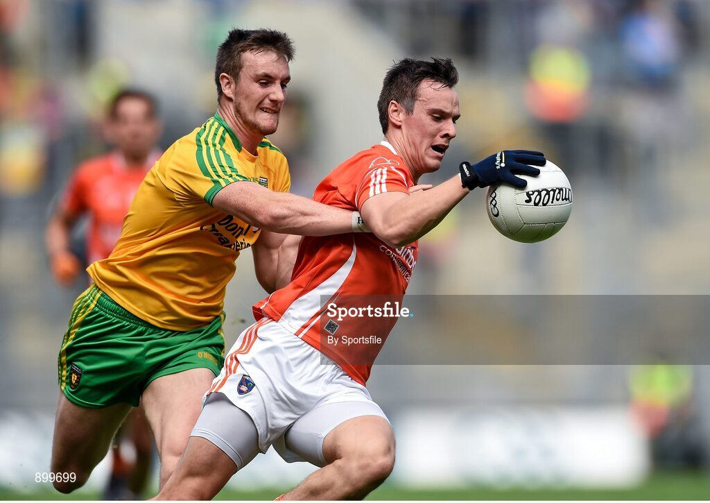 9 August 2014; Mark Shields, Armagh, in action against Leo McLoone, Donegal. GAA Football All-Ireland Senior Championship, Quarter-Final, Donegal v Armagh, Croke Park, Dublin. Photo by Sportsfile