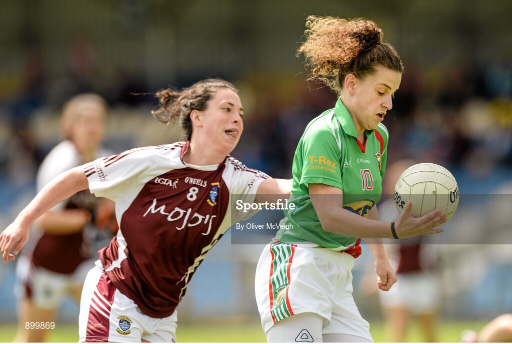 9 August 2014; Kathryn Sullivan, Mayo, in action against Maud Annie Foley, Westmeath. TG4 All-Ireland Ladies Football Senior Championship, Round 2 Qualifier, Mayo v Westmeath, Pearse Park, Longford. Picture credit: Oliver McVeigh / SPORTSFILE