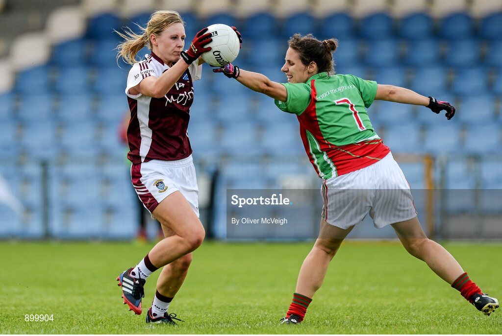 9 August 2014; Fiona Claffey, Westmeath, in action against Marth Carter, Mayo. TG4 All-Ireland Ladies Football Senior Championship, Round 2 Qualifier, Mayo v Westmeath, Pearse Park, Longford. Picture credit: Oliver McVeigh / SPORTSFILE