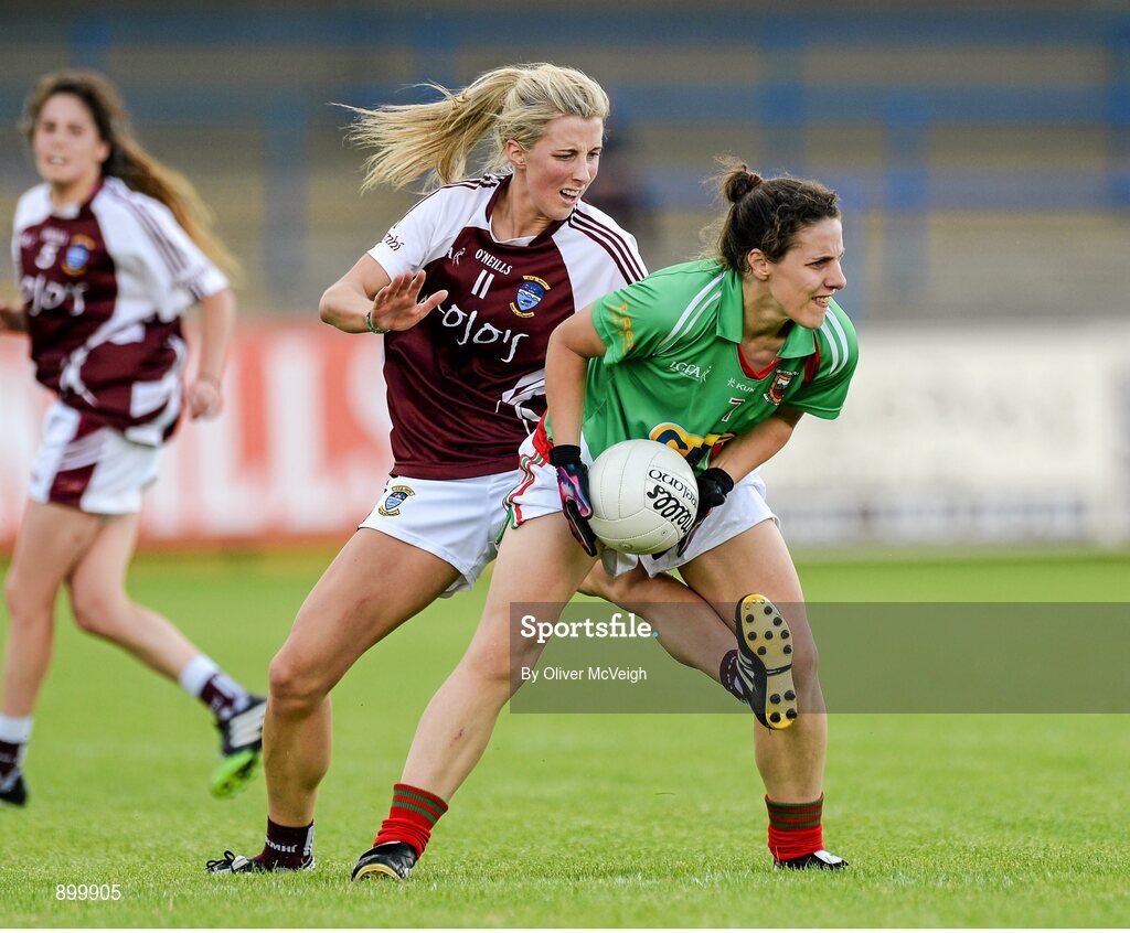 9 August 2014; Martha Carter, Mayo, in action against Joanna Maher, Westmeath. TG4 All-Ireland Ladies Football Senior Championship, Round 2 Qualifier, Mayo v Westmeath, Pearse Park, Longford. Picture credit: Oliver McVeigh / SPORTSFILE