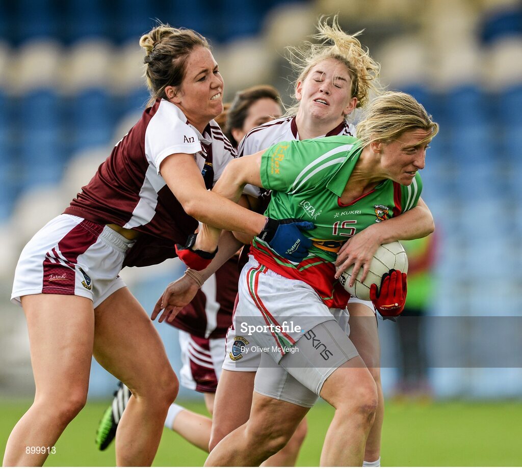9 August 2014; Cora Staunton, Mayo, in action against Rebecca Dunne and Lorraine Duncan, Westmeath. TG4 All-Ireland Ladies Football Senior Championship, Round 2 Qualifier, Mayo v Westmeath, Pearse Park, Longford. Picture credit: Oliver McVeigh / SPORTSFILE