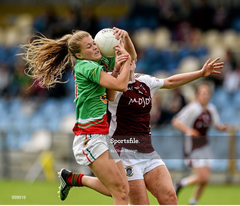 9 August 2014; Sarah Rowe, Mayo, in action against Triona Durkan Westmeath. TG4 All-Ireland Ladies Football Senior Championship, Round 2 Qualifier, Mayo v Westmeath, Pearse Park, Longford. Picture credit: Oliver McVeigh / SPORTSFILE