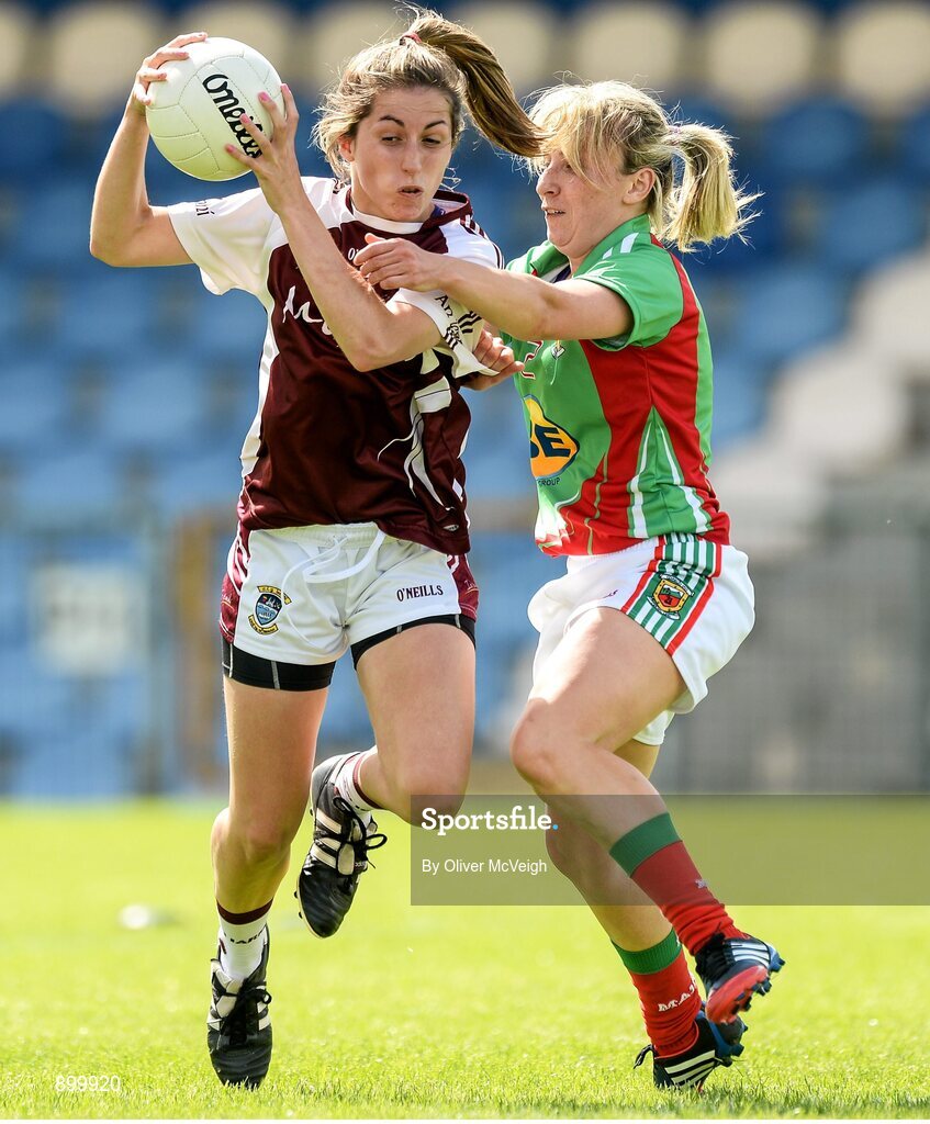 9 August 2014; Karen Hegarty, Westmeath, in action against Marie Corbett, Mayo. TG4 All-Ireland Ladies Football Senior Championship, Round 2 Qualifier, Mayo v Westmeath, Pearse Park, Longford. Picture credit: Oliver McVeigh / SPORTSFILE