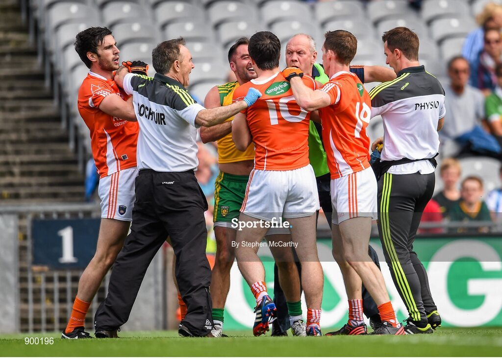 9 August 2014; Donegal team doctor Kevin Moran tries to seperate Armagh's Aaron Findon, left, Aidan Forker and Finnian Moriarty, right, from Donegal's Karl Lacey. GAA Football All-Ireland Senior Championship, Quarter-Final, Donegal v Armagh, Croke Park, Dublin. Picture credit: Stephen McCarthy / SPORTSFILE