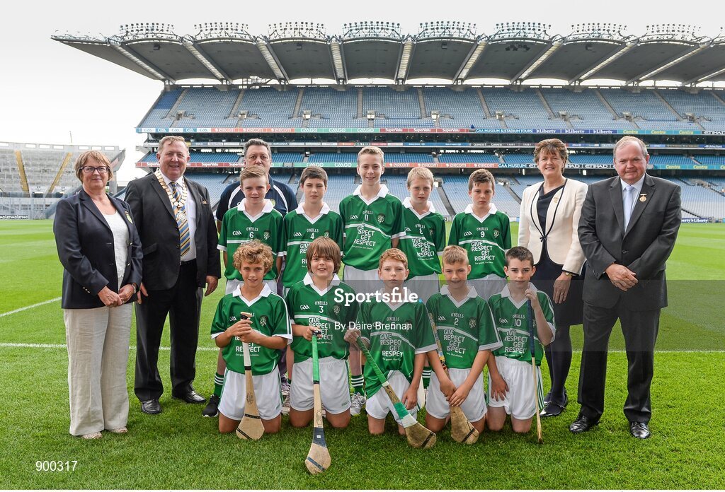 10 August 2014; Uachtarán Chumann Lúthchleas Gael Liam Ó Néill, right, President of the Camogie Association Aileen Lawlor, and INTO President Seán McMahon, with the Limerick team, back row, left to right, Lee Kenny, St. Peter Apostle S.N.S., Neilstown, Co. Dublin, Liam Ó Dochartaigh, Buncrana, Co. Donegal, Kevin Kenneally, Kilmovee N.S., Ballaghderreen, Co. Mayo, Seán Maher, Doon C.B.S., Co. Limerick, Seán Cromolly, St. Patrick's, Bruree, Co. Limerick, front row, left to right, Seán Woods, St. Corban's B.N.S., Naas, Co. Kildare, Dáithí Óg Mac Riobeaird, Scoil Chonaill, An Bun Beag, Co. Donegal, Oisín Coulter, St. Patrick's Ballygalget, Co. Down, Ciarán Boyd, Christ Redeemer P.S., Dunmurry, Co. Antrim, and Diarmuid Kelly, St. Sinneach's N.S., Colehill, Co. Longford. INTO/RESPECT Exhibition GoGames, Croke Park, Dublin. Picture credit: Dáire Brennan / SPORTSFILE
