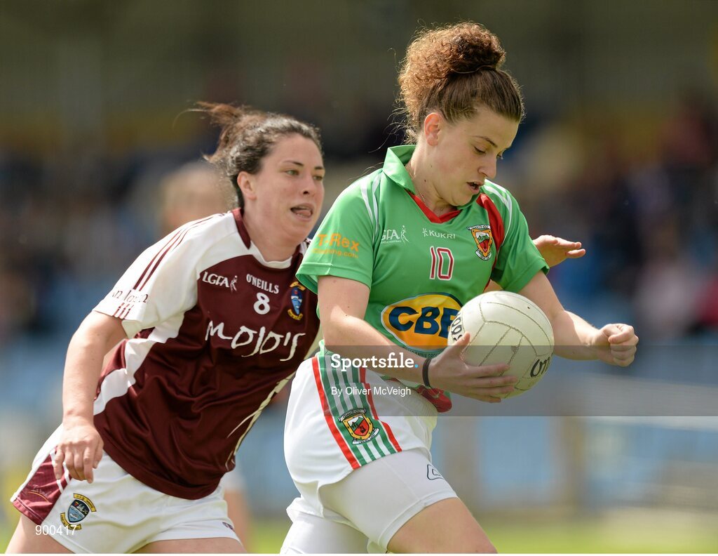 9 August 2014; Kathryn Sullivan, Mayo, in action against Maud Annie Foley, Westmeath. TG4 All-Ireland Ladies Football Senior Championship, Round 2 Qualifier, Mayo v Westmeath, Pearse Park, Longford. Picture credit: Oliver McVeigh / SPORTSFILE