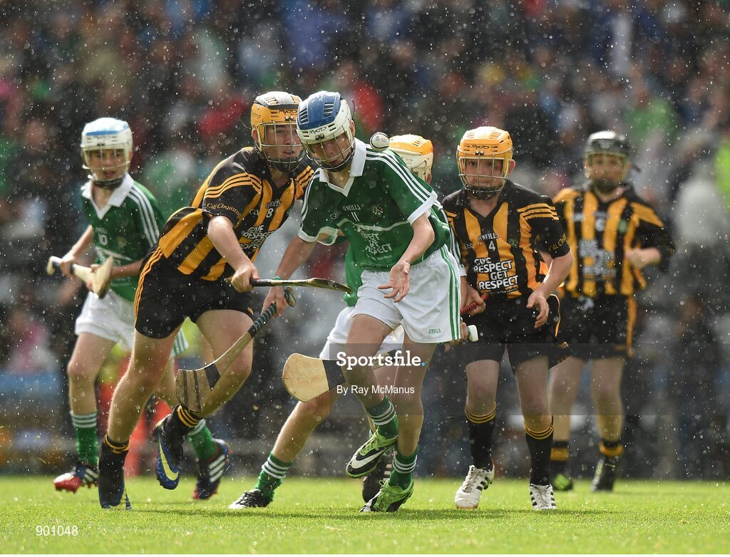 10 August 2014; Kevin Kenneally, Kilmovee N.S., Ballaghderreen, Co. Mayo, representing Limerick, in action against Jay Buggy, The Heath N.S., Co. Laois, representing Kilkenny. INTO/RESPECT Exhibition GoGames, Croke Park, Dublin. Picture credit: Ray McManus / SPORTSFILE