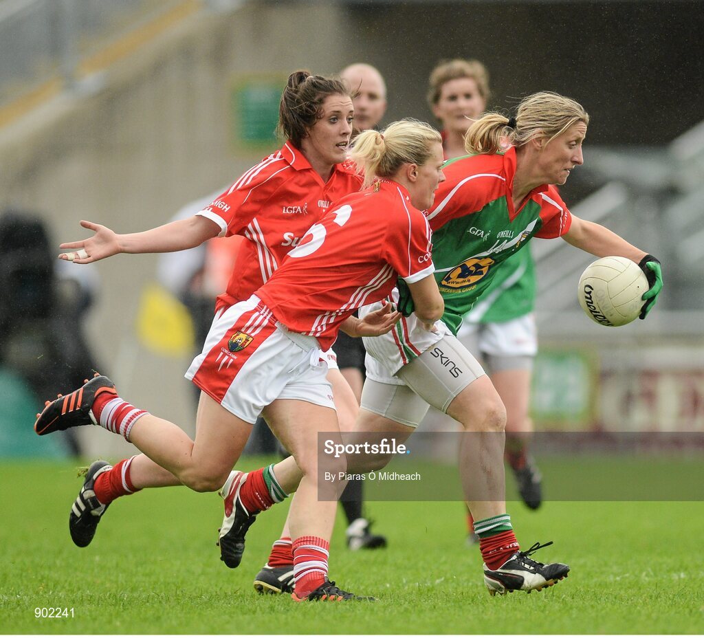 16 August 2014; Cora Staunton, Mayo, in action against Deidre Reilly, centre, and Ciara O'Sullivan, Cork. TG4 All-Ireland Ladies Football Senior Championship, Quarter-Final, Cork v Mayo, O'Connor Park, Tullamore, Co. Offaly. Picture credit: Piaras O Midheach / SPORTSFILE
