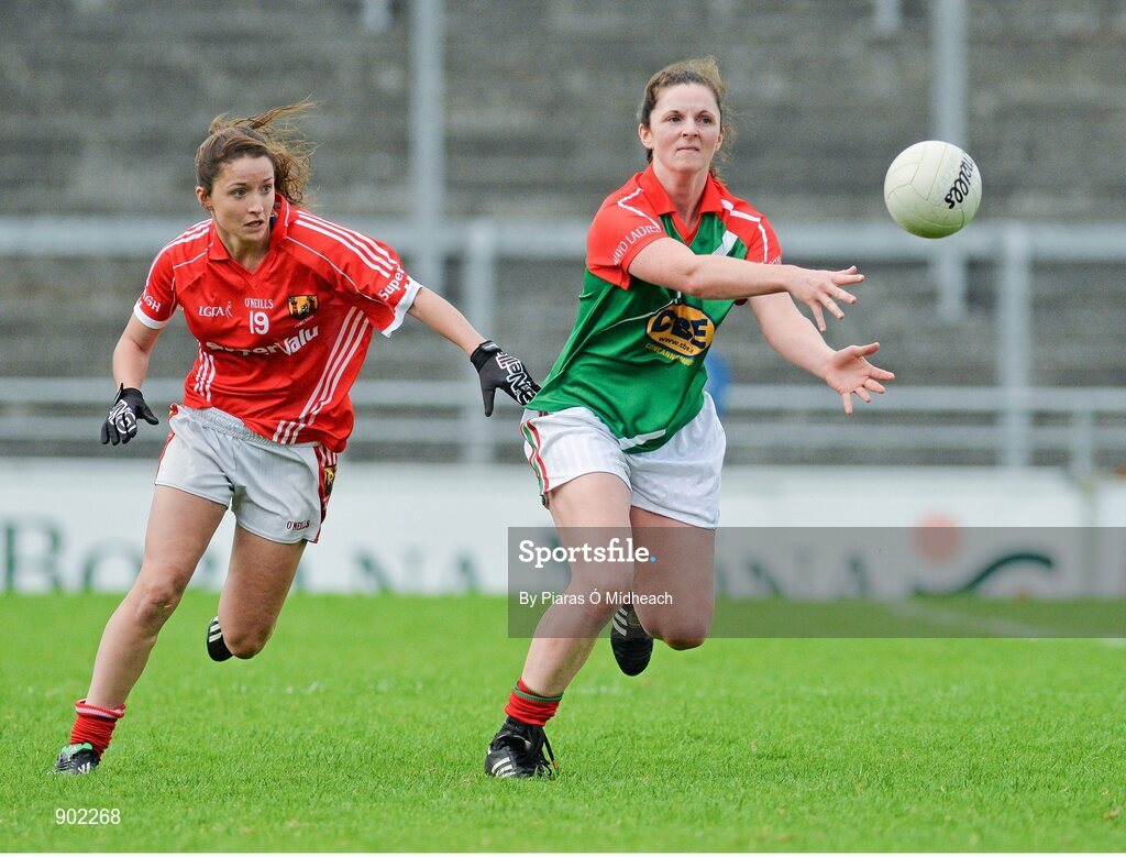 16 August 2014; Helena Lohan, Mayo, in action against Eimear Scally, Cork. TG4 All-Ireland Ladies Football Senior Championship, Quarter-Final, Cork v Mayo, O'Connor Park, Tullamore, Co. Offaly. Picture credit: Piaras O Midheach / SPORTSFILE