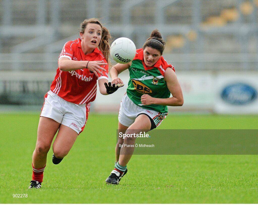 16 August 2014; Orlagh Farmer, Cork, in action against Amy Bell, Mayo. TG4 All-Ireland Ladies Football Senior Championship, Quarter-Final, Cork v Mayo, O'Connor Park, Tullamore, Co. Offaly. Picture credit: Piaras O Midheach / SPORTSFILE