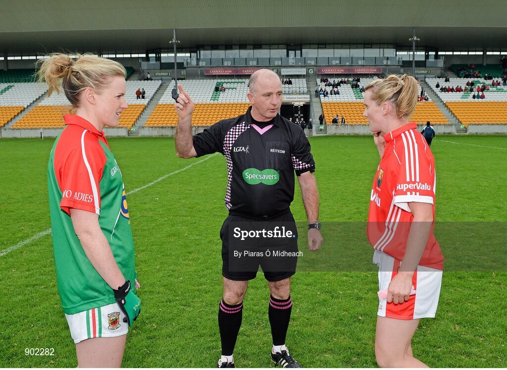 16 August 2014; Referee Gavin Corrigan with captains Fiona McHale, left, Mayo, and Briege Corkery, Cork. TG4 All-Ireland Ladies Football Senior Championship, Quarter-Final, Cork v Mayo, O'Connor Park, Tullamore, Co. Offaly. Picture credit: Piaras O Midheach / SPORTSFILE