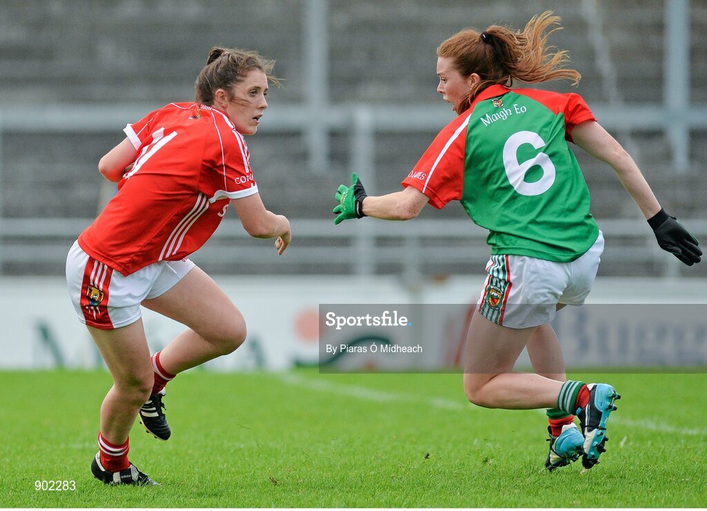 16 August 2014; Ciara O'Sullivan, Cork, in action against Sarah Tierney, Mayo. TG4 All-Ireland Ladies Football Senior Championship, Quarter-Final, Cork v Mayo, O'Connor Park, Tullamore, Co. Offaly. Picture credit: Piaras O Midheach / SPORTSFILE