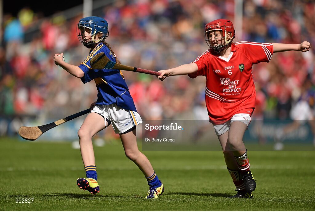 17 August 2014; Niamh Brady, representing St. Mary's National School, Westmeath, in action against Gabriella Ní Dhuglás Scoil an tSeachtar Laoch, Dublin. INTO/RESPECT Exhibition GoGames, Croke Park, Dublin. Picture credit: Barry Cregg / SPORTSFILE