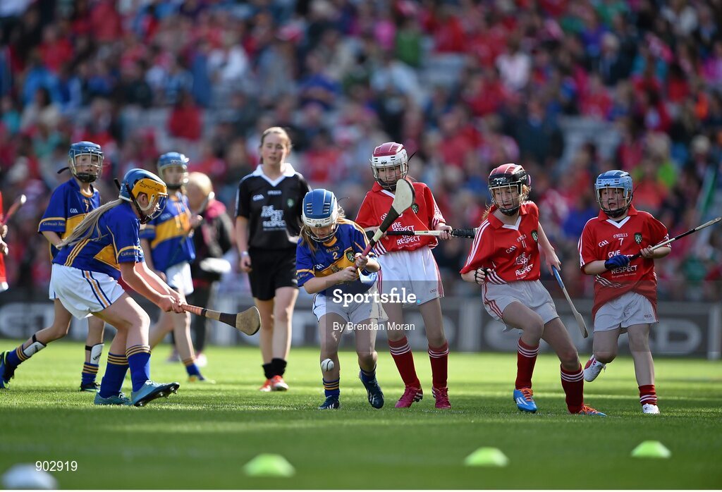 17 August 2014; Aisling Lonergan, Thomastown National School, Tipperary and Kirsty Morgan O'Reilly, Scoil Mhuire, Monaghan, representing Tipperary, in action against Cianna Deegan, Marist National School, Dublin, Ava Sweeney, Scoil Mhuire, Roscommon and Lauren O'Keefe, St Dominic's National School, Dublin, representing Cork. INTO/RESPECT Exhibition GoGames, Croke Park, Dublin. Picture credit: Brendan Moran / SPORTSFILE