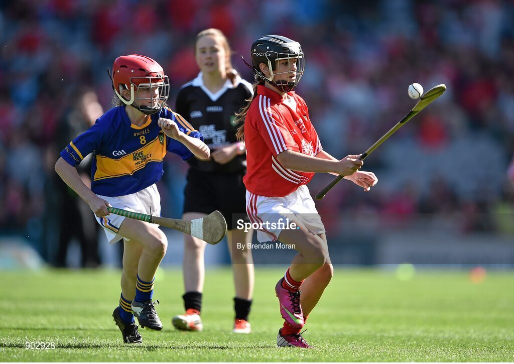 17 August 2014; Tara Bermingham Nolan, Drumphea National School, Carlow, representing Cork, in action against Meaghan Clarke, Lady of Lourdes Primary School, Tyrone, representing Tipperary. INTO/RESPECT Exhibition GoGames, Croke Park, Dublin. Picture credit: Brendan Moran / SPORTSFILE